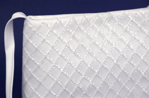 Uszyta z białej satyny, na przodzie warstwa tiulu haftowanego przezroczystymi cekinami. Cekiny subtelnie i elegancko połyskują, nadając torebce niezwykłego uroku.