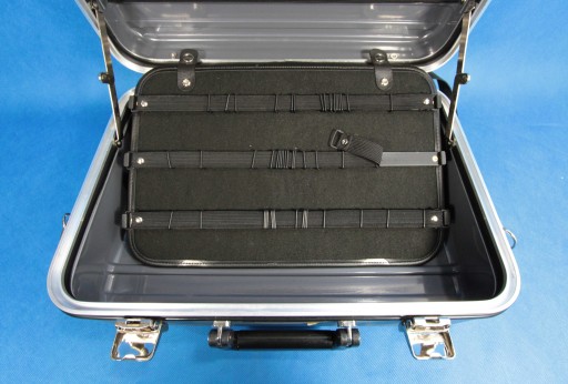 Cała przegródka z narzędziami zamyka górną połówkę walizki i utrzymywana jest w tym położeniu za pomocą rzepa. Jednocześnie może być w całości wyjęta po odpięciu rzepa i dwóch zatrzasków w dolnej części. Bardzo upraszcza to dostęp do wszystkich narzędzi na czas serwisu.
