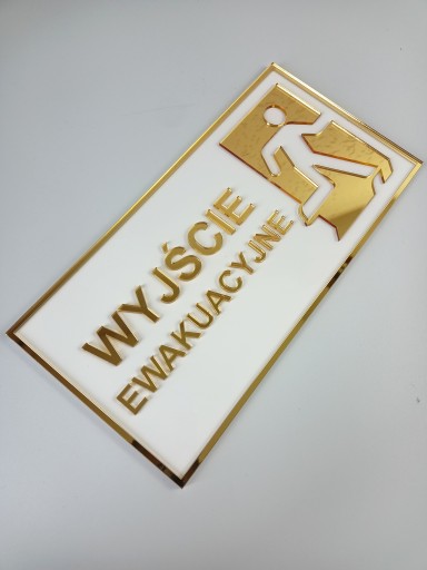 Akrylowa Tabliczka WYJŚCIE EWAKUACYJNE z lustrzanymi napisami i piktogramami.