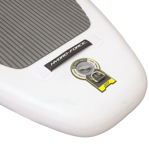 Hydro Force Oceana XL Combo 10'0" to model pochodzący od największego na świecie producenta desek pompowanych SUP - Bestway. Jego popularność wynika z połączenia zaawansowanych technicznie produktów z przystępnymi cenami. Wymiary paddleboarda (305x84x15 cm) oraz jego kształt dają całkowitą wyporność równą 320 l oraz udźwig wynoszący 130 kg. Dzięki temu bez problemu możemy wziąć na pokład dziecko lub czworonoga. Wówczas ciężar rozkłada się w dwóch miejscach i jeżeli sumarycznie nie przekracza 130 kg to deska będzie prawidłowo zachowywać się na wodzie. W przypadku jednego wioślarza stojącego na środku deski rekomendujemy żeby jego waga nie przekraczała 95-100 kg. Paddleboard przeznaczony jest do pływania na wodach spokojnych ale poradzi sobie równie dobrze na małych falach. Wszystko to sprawia, że Oceana to świetny wybór dla całej rodziny.