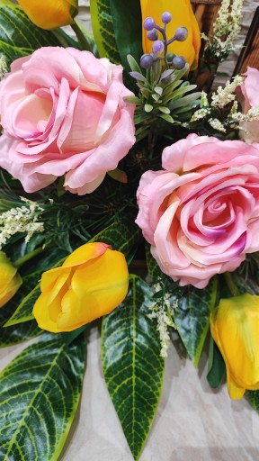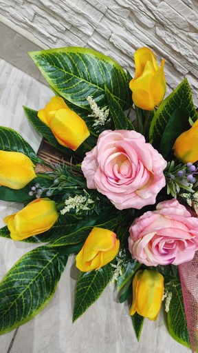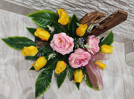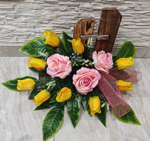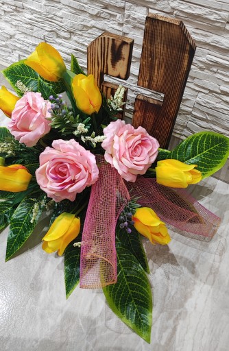 Sprzedam piękną kompozycję nagrobną stroik na Wielkanoc na drewnianej podstawie w której wycięty jest krzyż, wykonana z kwiatów sztucznych tulipanów i róż bardzo dobrej jakości, które przypominają żywe.