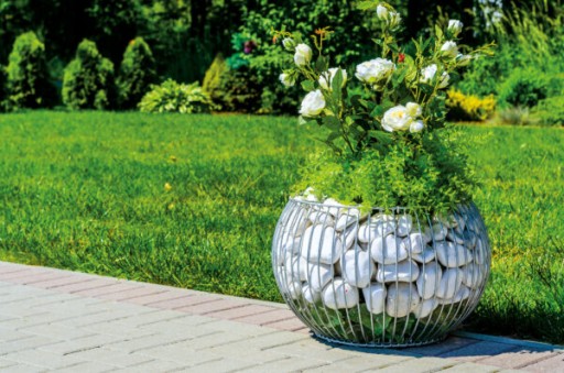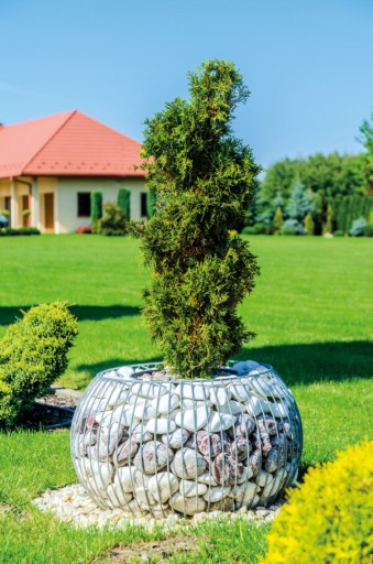 Całość pokryta jest ocynkiem, który zapewnia długą możliwość eksploatacji (pozostawienie jej na zewnątrz domu nie spowoduje, że donica straci na swoim uroku). Konstrukcja jest stabilna i odporna na różne warunki atmosferyczne. Możliwość wypełnienia różnymi materiałami takimi jak kamień, kawałkami drewna, szkłem, szyszkami bądź innymi materiałami jakie tylko Państwu przyjdą do głowy.