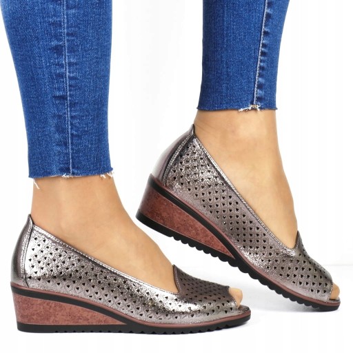 AŻUROWE PÓŁBUTY NA WYGODNEJ I NIE WYSOKIEJ KOTURNIE PEWTER SREBRNE METALICZNY KOLOR