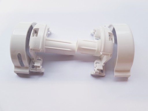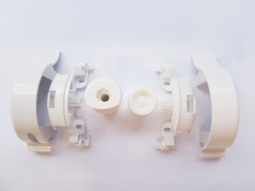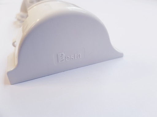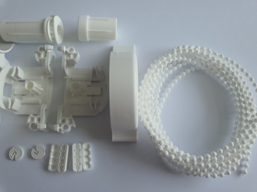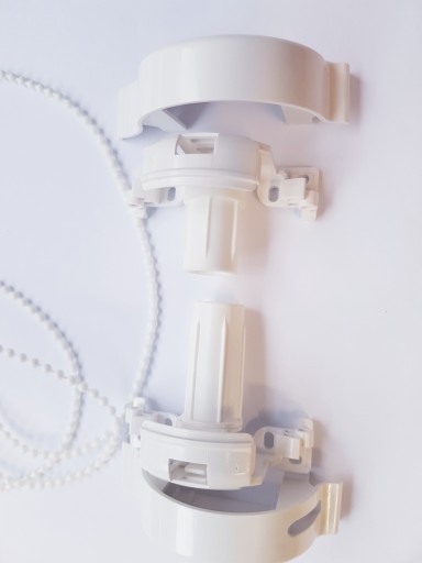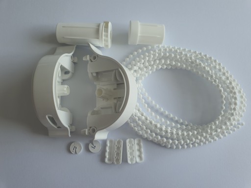 Kompletny zestaw montażowy do rolety Besta w kasecie w komplecie z łańcuszkiem, dwoma łącznikami i dwoma ogranicznikami w kolorze białym.