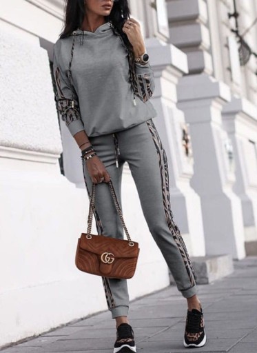Komplet dresowy składający się z bluzy z kapturem oraz zwężanych spodni. Posiada lampas w ciekawy wzór, dzięki czemu tworzy spójną całość.