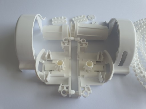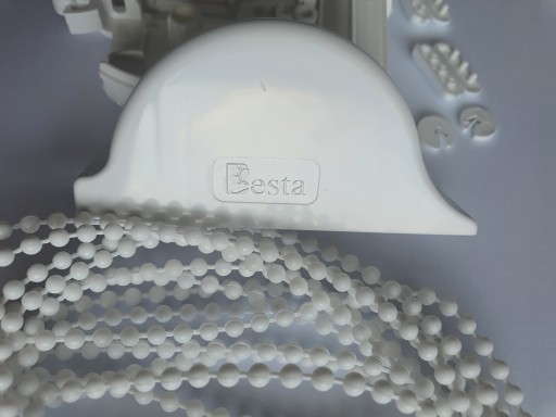 Kompletny zestaw montażowy do rolety Besta w kasecie w komplecie z łańcuszkiem, dwoma łącznikami i dwoma ogranicznikami w kolorze białym.
