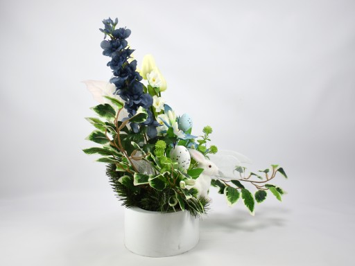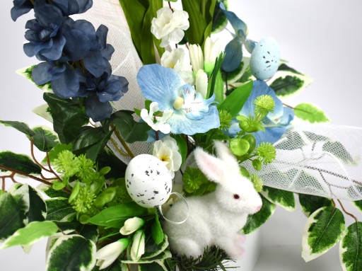 Dodatkowy element w postaci pisanki w bukiecie dodaje charakterystycznego świątecznego akcentu.