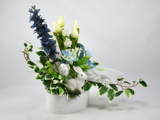 Ta wiosenna aranżacja o delikatnych kolorach nie tylko zdobi groby, ale także stanowi doskonały dodatek do świątecznego stołu, wprowadzając atmosferę radości i świeżości.