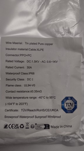 Przewody o średnicy 6mm2 mogą być stosowane w instalacjach do 30A. Konektory szeregowe pasują do większości paneli słonecznych jakie są dostępne na rynku.