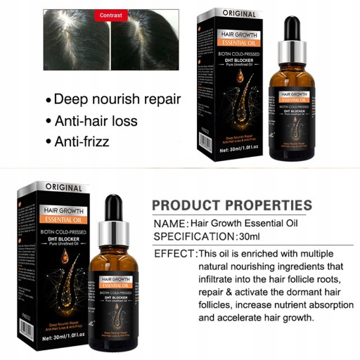 Efekt: Ten olej jest wzbogacony wieloma naturalnymi odżywczymi składnikami, które wbijają się w korzenie mieszków włosowych, naprawiają i aktywują uśpione fryzury, zwiększają wchłanianie składników odżywczych i przyspieszają wzrost włosów.