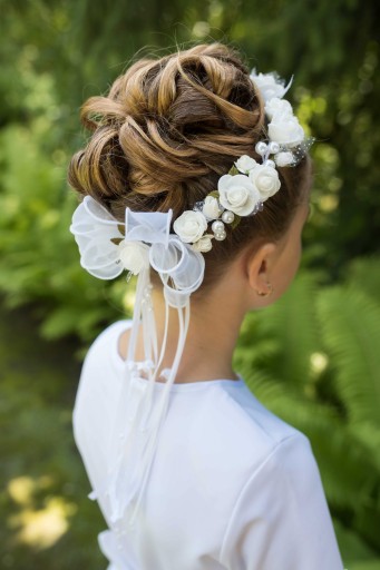 Niezwykle delikatny, stonowany a zarazem uroczy i wyjątkowy, najczęściej wybierany wianek do I Komunii Świętej. Upleciony z różyczek, delikatnych perełek oraz z drobnymi listkami. Dodatkowo zdobiony perełkami oraz tiulem, dzięki temu podkreśla delikatną urodę dziewczynek oraz białą stylizację w dniu Komunii.