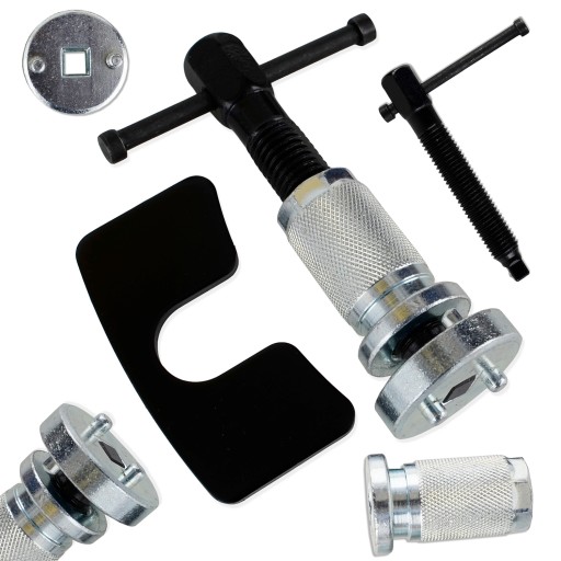 Zestaw do cofania tłoczków hamulcowych prawostronnych w motocyklach i samochodach osobowych z praską gwintowaną – prawostronną z 2 adapterami. Praska posiada 6-kątna końcówkę, dzięki której można użyć klucza.