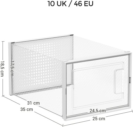 Praktyczny organizer na buty - zestaw 18 pudełek, które pomogą uporządkować Twoją kolekcję butów. Pudełka są wykonane z przejrzystego tworzywa, co pozwala na łatwe znalezienie właściwej pary butów bez potrzeby otwierania każdego pudełka. Montaż jest szybki i prosty, wystarczy złożyć 3 części, aby stworzyć organizer o wymiarach wewnętrznych 31 x 24,5 x 17,5 cm, który pomieści buty do rozmiaru 44. Pudełka można ułożyć jedno na drugim, aby zaoszczędzić miejsce w szafie, a także stawiać obok siebie. Wszystkie pudełka posiadają otwory wentylacyjne, co zapewnia przewiew butom. To idealne rozwiązanie dla osób, które pragną utrzymać porządek w swojej kolekcji butów.