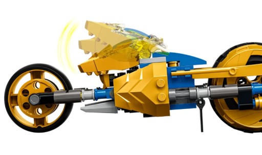 - Zabawkowy smoczy motocykl — model motocykla ma dwa duże koła i siodełko dla złotego smoczego Jaya, przód w kształcie głowy złotego smoka z ruchomą paszczą oraz złote panele boczne