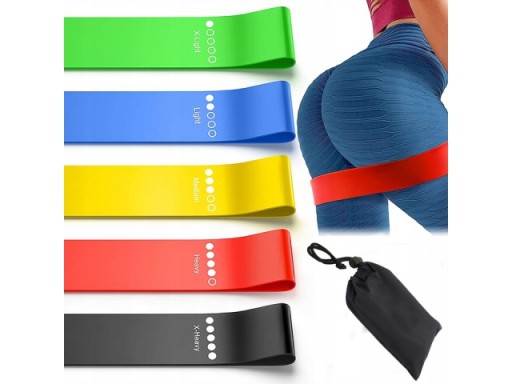 - Zestaw pięciu gum treningowych o szerokim zakresie zastosowań.