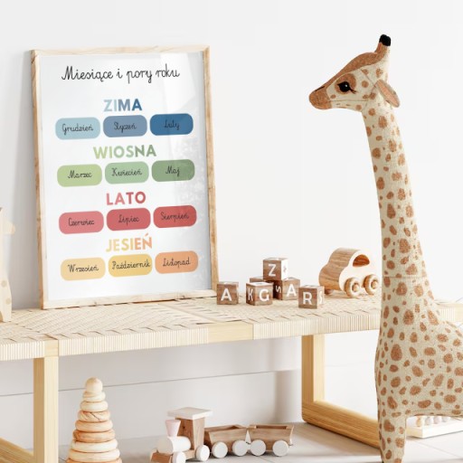 Piękny plakat dla dzieci z kolorowymi nazwami miesięcy, który stanowi doskonałe narzędzie edukacyjne. Dla łatwej nauki każda pora roku jest oznaczona jednym kolorem. Dzięki plakatowi dziecko nauczy się nazw wszystkich miesięcy oraz pór roku. Plakat stanowi przepiękny element dekoracyjny, ale i cenną naukę, która utrwalana codziennie zapada w pamięć dziecka.