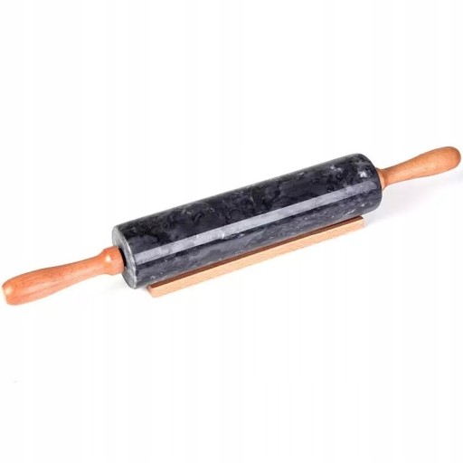 Wałek wykonany z marmuru, z dwiema drewnianymi rączkami oraz podstawką.