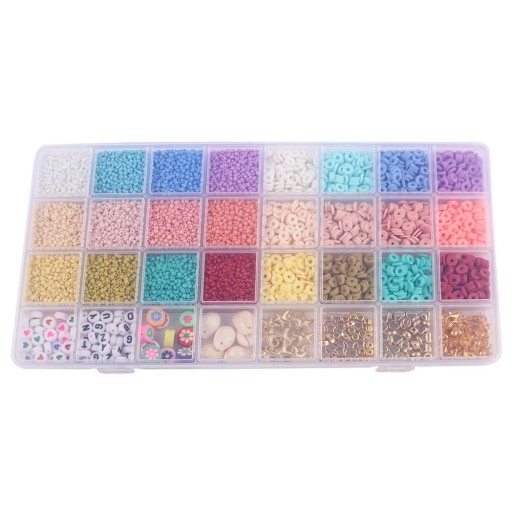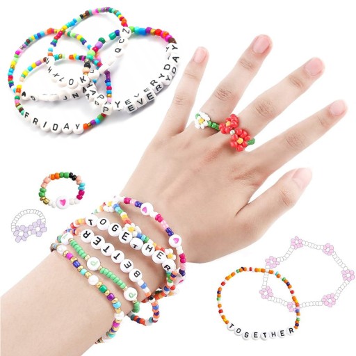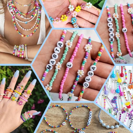 Magia kolorów, literki, serduszka czy zawieszki rozgwiazdy, muszelki lub urocze kwiatki oraz liczne akcesoria pozwolą małej projektantce na wykonanie ozdobnej jedynej w swoim rodzaju biżuterii. Zestaw łączy w sobie koraliki typu seeds, koraliki płaskie oraz liczne dodatki, dzięki czemu daje nieskończone możliwości tworzenia modnej biżuterii takiej jak: naszyjniki, łańcuszki, bransoletki kolorowe, bransoletki imienne, bransoletki przyjaźni, pierścionki, łańcuszki do okularów, breloczki do kluczy.