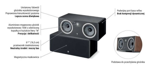 Vestia Center to głośnik centralny w linii Vestia. Podczas jego rozwoju, szczególnie wyróżniała się komplementarność jego barwy z innymi głośnikami Vestia. Doskonale uzupełnia on system wielokanałowy, zapewniając mu spójność projektu i dźwięku, a także wierną reprodukcję podczas sesji odsłuchowych kina domowego. Pochylona podstawa dostarczana wraz z głośnikiem wzmacnia scenę dźwiękową i pozwala cieszyć się wyjątkowymi wrażeniami kinowymi w domu. typ: 2-drożna kolumna centralna typu bass-reflex przetworniki: 2x 61/2" (16.5cm) Slatefiber Mid-bass, 1" (25mm) Al/Mg odwrócona kopułka TAM tweeter czułość (2,83V/1m): 91,5dB pasmo przenoszenia (±3dB): 58Hz - 30kHz punkt niskiej częstotliwości (-6dB): 50Hz impedancja nominalna: 8 Ω impedancja minimalna: 3.6 Ω zalecana moc wzmacniacza: 40 - 200W częstotliwość zwrotnicy: 2,700Hz wymiary produktu: 537 x 216 x 259 mm waga netto: 10,00 kg