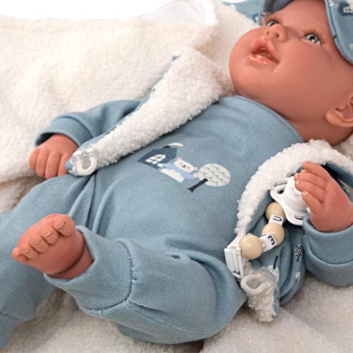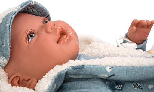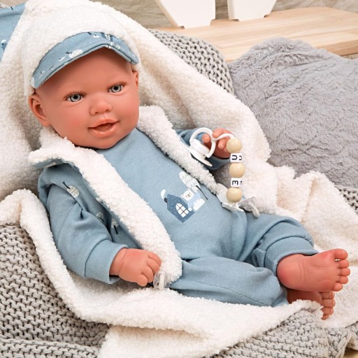 - Lalka Arias 45 cm Bruno z ubrankami i kocykiem w odcieniach błękitu i bieli. Wykonana jest ręcznie, z maksymalną dbałością o wszystkie charakterystyczne dla noworodków detale. Jej ciało jest miękkie, a kończyny wykonane są z winylu.