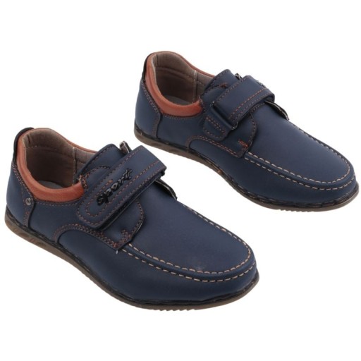 Półbuty chłopięce na płaskiej podeszwie, z zaokrąglonym noskiem. Zapinane na rzep. Cholewka sięgająca przed kostkę. Wykonane z ekoskóry, udekorowane przeszyciami i dopasowaną kolorystycznie wstawką z ekoskóry (po bokach). W środku wkładka ze skóry naturalnej. Dobrze wyglądają w zestawieniu z materiałowymi spodniami o klasycznym kroju i gładką koszulą.
