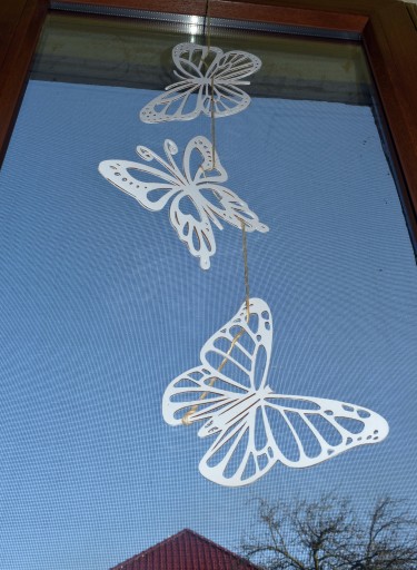 Na zdjęciach przykładowa aranżacja motyli zawieszonych na sznurku jutowym.