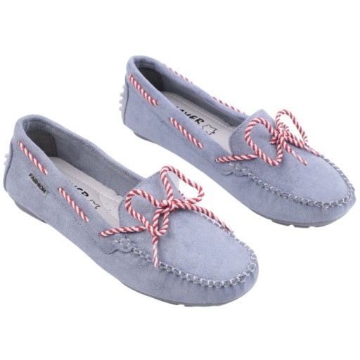 Klasyczne mokasyny damskie z charakterystycznym rzemykiem wokół cholewki i przeszyciem wokół noska, urozmaicone o kokardkę z przodu. Wykonane z ekozamszu o gładkim wzorze. W środku mięciutka wkładka ze skóry naturalnej, z wbudowaną miękką pianką.