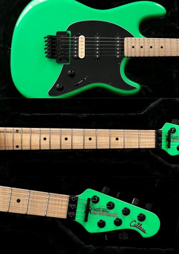 Here for sale 2022 Ernie Ball Music Man Ball Family Reserve Cutlass HSS Floyd Rose BFR in Lime Green. The guitar is in excellent condition and comes with original case. Only 40 made! This special "Eighties" limited edition Cutlass HSS BFR features a basswood body finished in a bright lime green finish. Smooth figured maple neck with maple fingerboard is accented with larger black position markers and matching painted headstock. The electronics feature the ever-popular custom wound Axis bridge pickup in tandem with 2 Ernie Ball Music Man designed mid-sixties style single-coil pickups. The resulting tones are very reminiscent of the beloved mid 80's crunch that ruled MTV in the middle of the decade. This BFR edition guitar comes with a Music Man licensed Floyd Rose locking tremolo and locking tuners for ultimate tuning stability. 3-ply black pickguard with matching black plastic parts and all-black hardware completes the overall aesthetic package.
