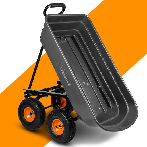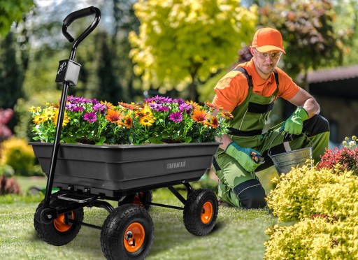 Wózek ogrodowy posiada funkcję wywrotki, która pozwala w kilku sekund opróżnić przyczepkę. Ogromnie przydatna funkcja pozwalająca na przyspieszenie prac z wykorzystaniem wózka. Raz dwa opróżnisz załadowany wózek.