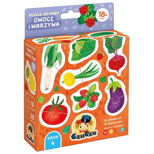 Edukacyjne dwuelementowe puzzle z tradycyjnymi łączeniami sprawdzą się jako mądry prezent dla malucha. W zestawie znajdziecie aż 19 dwuelementowych puzzli z uroczymi ilustracjami, które przedstawiają ulubione owoce i warzywa. Zabawa z nimi to świetny sposób na mądre spędzanie czasu.