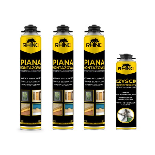 Zestaw składa się z 3 sztuk piany montażowej RHINO oraz czyścika do pianki RHINO