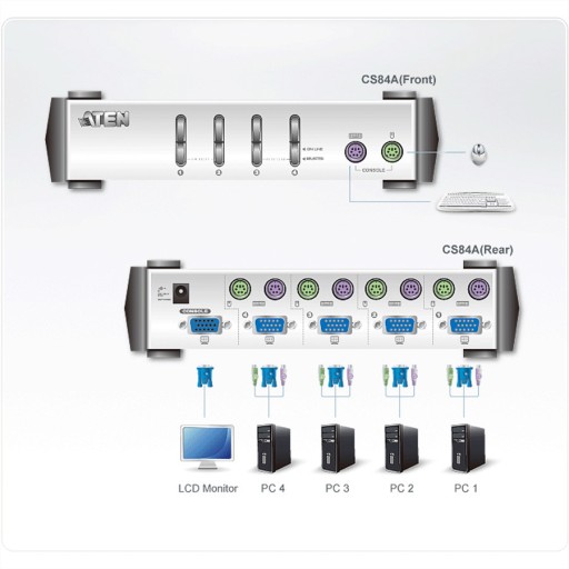 Przełącznik KVM CS84A ma wbudowane porty PS/2 z przodu i z tyłu. Umożliwia sterowanie 4 serwerami z jednej konsoli i przełączanie się między podłączonymi komputerami za pomocą przycisków na panelu przednim lub klawiszy skrótu na klawiaturze konsoli. Jest to najbardziej praktyczne i najprostsze rozwiązanie do sterowania wieloma komputerami.