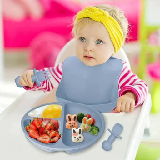 🍽️Zawiera 2 silikonowe widelce, 2 silikonowe łyżki, silikonowy śliniaczek, silikonową płytkę, silikonową miskę i silikonowy kubek do picia. Każdy element wykonany jest z wysokiej jakości silikonu przeznaczonego do kontaktu z żywnością i nie zawiera BPA.