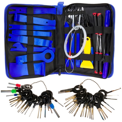 - WIELE ELEMENTÓW W ZESTAWIE – w zestawie ściągaczy do tapicerki znajduje się wiele elementów – oprócz 12 ściągaczy do tapicerki są tutaj również szczypce do spinek, 2 łapki do spinek (22,5 i 31 cm), a także 8 wyjmaków do radia, 38 kluczy do pinów, futerał na zamek i 4 haki do ściągania uszczelek.