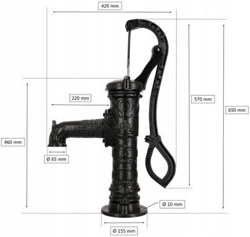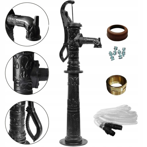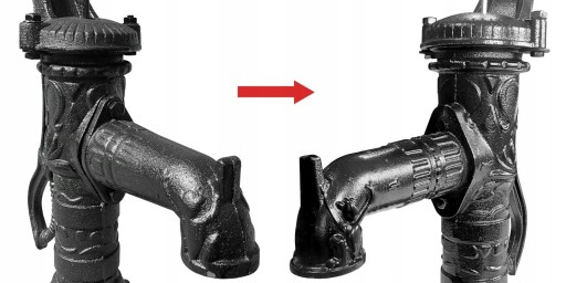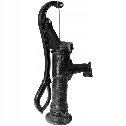 - Pompując wodę za sprawą rączki i przymocowanej do niej dźwigni wprawiamy tłok w ruch, który zasysa wodę ze studni. Specjalny zawór bagnetowy, blokuje powrót wypompowanej wody z powrotem do studni.