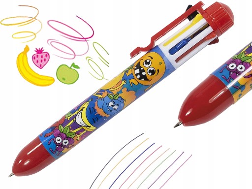 Długopis zapachowy od Kidea z wkładami w ośmiu intensywnych kolorach: czarnym, żółtym, niebieskim, zielonym, pomarańczowym, czerwonym, różowym i fioletowym.