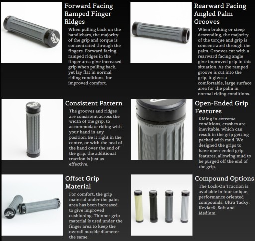 ✅ Palm Grooves — skierowane tyłem do kierunku jazdy, zakrzywione rowki na dłonie; Podczas hamowania lub stromych zjazdów większość momentu obrotowego i przyczepności koncentruje się na dłoni. Rowki wycięte pod kątem skierowanym do tyłu zapewniają w tej sytuacji lepszą przyczepność. Wycięcie w chwycie zapewnia wygodną, dużą powierzchnię dłoni w normalnych warunkach jazdy. Spójny wzór na całej szerokości chwytu zapewnia równie skuteczną dodatkową przyczepność podczas jazdy z ręką w dowolnej pozycji.