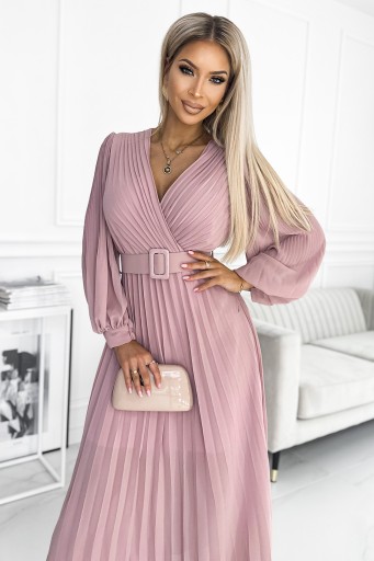 ЖЕНСКОЕ ДЛИННОЕ ПЛИССИРОВАННОЕ ПЛАТЬЕ С ПОЯСОМ, ПУДРО-РОЗОВОЕ