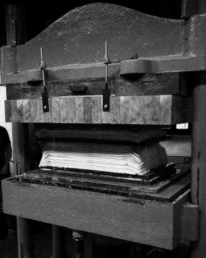 Papier produkowany jest z przygotowywanej tradycyjnymi metodami celulozy, czerpany w pełni ręcznie z użyciem sit, które pozostawiają przepiękny, widoczny pod światło układ linii, charakterystycznych dla papierów czerpanych.
