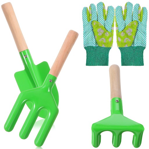 ⭐Zestaw Narzędzi Ogrodniczych Dla Dzieci - 4 Sztuki z Drewnianymi Uchwytami i Rękawiczkami
