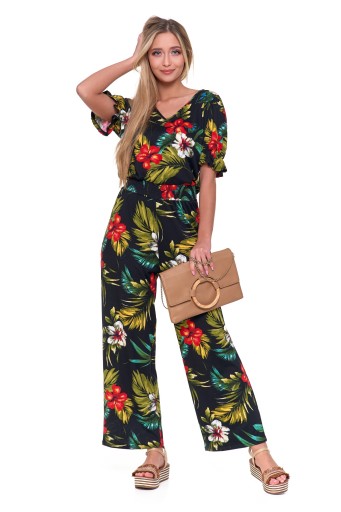 Krótkie rękawy dodają całości letniego charakteru, czyniąc ten kombinezon doskonałym wyborem na cieplejsze dni. Elastyczna gumka w pasie gwarantuje idealne dopasowanie do figury, podkreślając talię i modelując sylwetkę w sposób komfortowy i estetyczny.