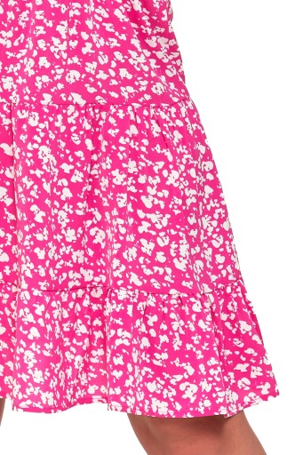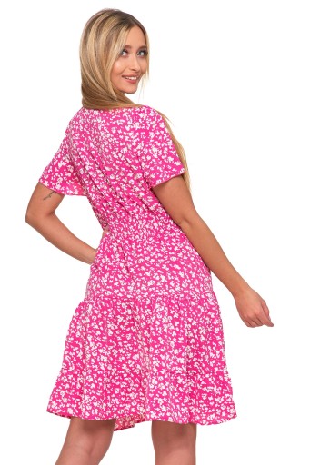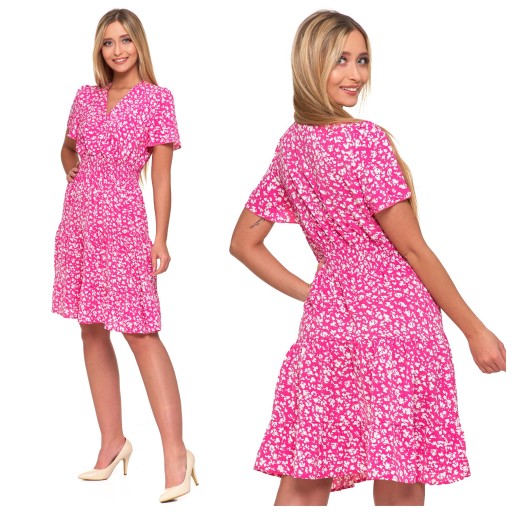 Szeroka, elastyczna gumka w pasie jest nie tylko praktycznym, ale również modnym elementem, który pozwala na idealne dopasowanie sukienki do różnych sylwetek, podkreślając talię i eksponując kobiece kształty. Długość sukienki, sięgająca do kolan (w zależności od wzrostu), sprawia, że model ten jest uniwersalny i pasuje na wiele różnych okazji.