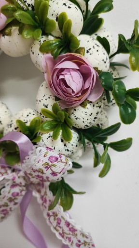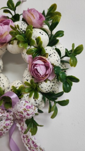 - Piękny dekoracyjny wianek ze styropianowymi jajkami, przyozdobiony gałązkami bukszpanu, peoniami oraz ozdobną kokardą.