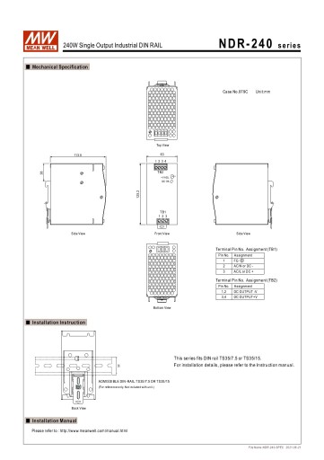 NDR-240 NDR to podstawowa seria zasilaczy przemysłowych w metalowej obudowie z filtrem PFC o wysokiej sprawności. NDR to seria zasilaczy przystosowana do instalacji na szynach montażowych TS-35/7.5 lub TS-35/15. Korpus ma szerokość 63 mm, co pozwala zaoszczędzić miejsce wewnątrz szafek. Cała seria zasilana napięciem AC od 90VAC do 264VAC i jest zgodna z normą BS EN/EN61000-3-2, normą regulowaną przez Unię Europejską dla prądu harmonicznych. Przy wydajności pracy do 90%, cała seria może pracować w temperaturze otoczenia od -20°C do 70°C w warunkach konwekcji powietrza.