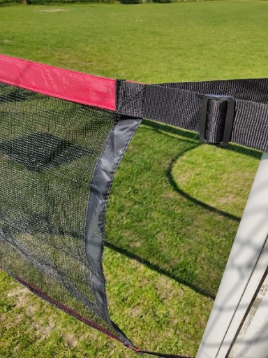 Do każdego ze słupków bramki plandeka mocowana jest za pomocą dwóch pasków z plastikową klamrą. Do poprzeczki bramki plandeka mocowana jest za pomocą 4 pasków z rzepem.