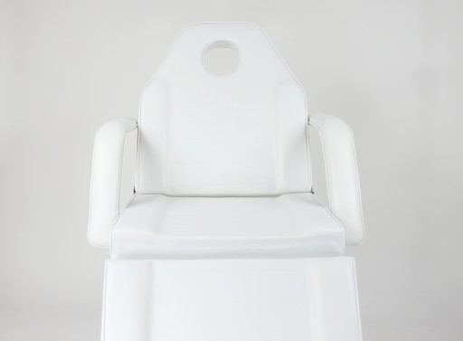 Praktyczny fotel kosmetyczny w kolorze białym. Jest jednym z elementów podstawowego wyposażenia gabinetów kosmetycznych, gabinetów masażu oraz makijażu permanentnego.