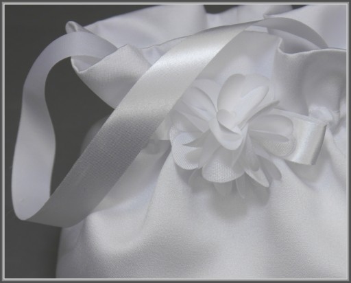 Rękawiczki komunijne i torebka satynowa w kształcie woreczka z usztywnianą wkładką pomagającą w zachowaniu kształtu woreczka nawet po obciążeniu. Woreczek został uszyty z satyny ślubnej pierwszego gatunku. Ozdobiony satynowym kwiatkiem 3d i satynową tasiemką klasy premium