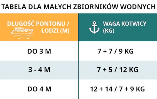 Równie ważny jest dobór odpowiedniej wagi kotwic w zależności od długości jednostki pływającej. Tabela pod spodem.