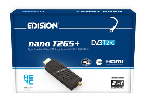 NANO T265+ to nowa propozycja od firmy EDISION w dziedzinie dekoderów, tunerów do odbioru sygnałów naziemnych i kablowych Full HD DVB-T2 / C w kompresji H.265 / HEVC 10 bit. Kieszonkowy odbiornik naziemny oferuje łatwą instalację, praktyczną funkcjonalność i szeroką gamę akcesoriów, dzięki czemu możesz cieszyć się ulubionymi programami telewizyjnymi w dowolnym miejscu. Zasilany tylko przez złącze USB w telewizorze, korzystnym rozmiar, odbiornik można łatwo schować za telewizorem. Odbiornik NANO obsługuje WiFi za pomocą adaptera USB w celu uzyskania dostępu do aplikacji internetowych takich jak YouTube, Pogoda i aktualizacje oprogramowania online. Dekoder posiada również funkcje odtwarzacza multimedialnego i obsługę audio Dolby Digital. Szczególną uwagę zwrócono na łatwość obsługi odbiornika. NANO T265+ towarzyszy ergonomiczny pilot 2 w 1 do obsługi. Gotowy i zaprogramowany z 4 najważniejszymi funkcjami dla telewizorów SAMSUNG i LG, możesz dowolnie zaprogramować 4 przyciski dla każdego telewizora.