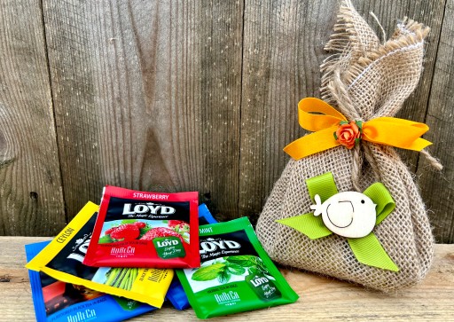 - zestaw smacznych herbatek zapakowanych w jutę,
